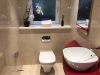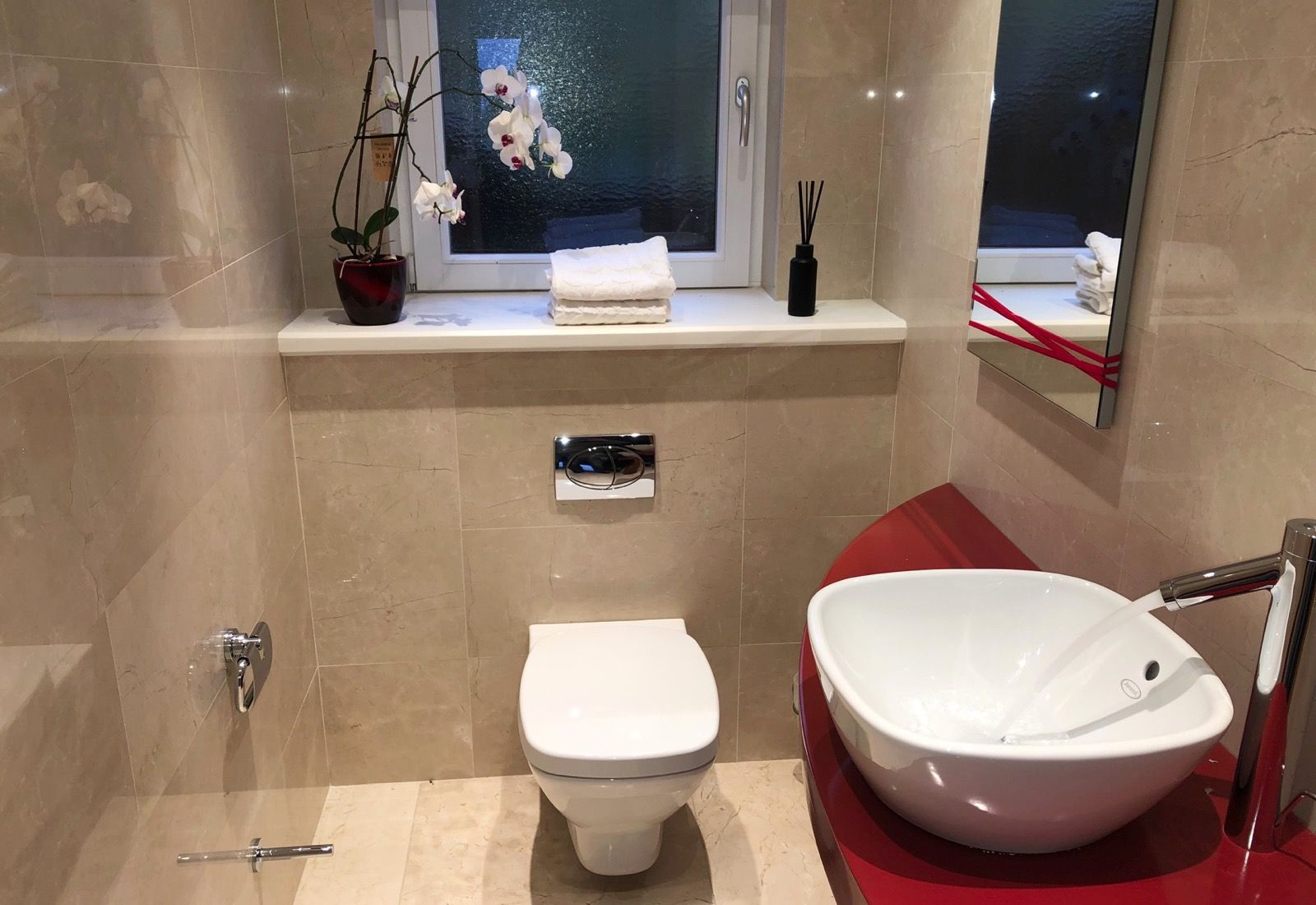Designed, supplied and installed by Bathroom Concepts. This stylish W.C. features wall hung toilet with concealed cistern, countertop basin with extended mono mixer tap and bespoke vanity unit. Wall and floor finished in polished marble.