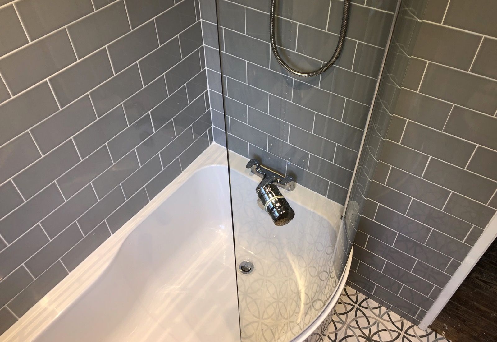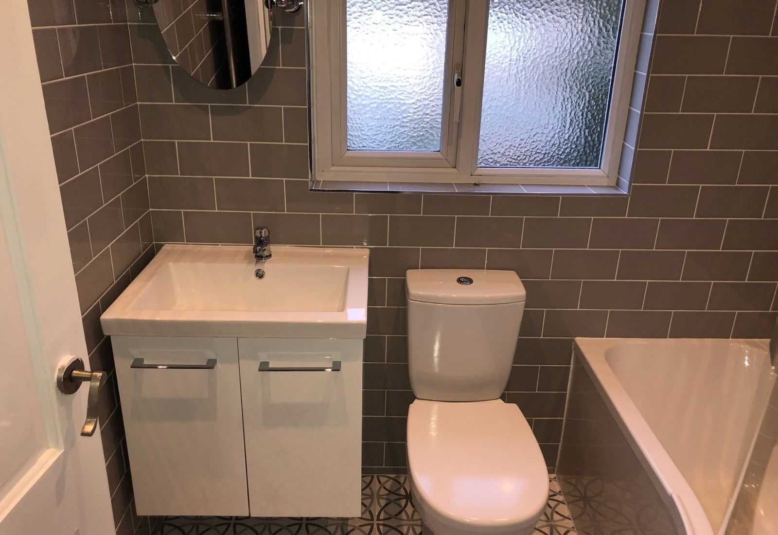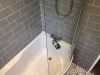 The installation of a p-shaped bath with built in shower and wall hung vanity unit maximises the space available in this compact bathroom.