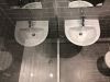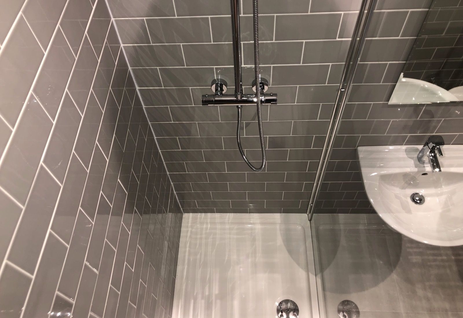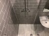 This small bathroom has a spacious feeling due to the use of subway tiles, wall hung basin and pedestal and a wet screen panel on the shower.